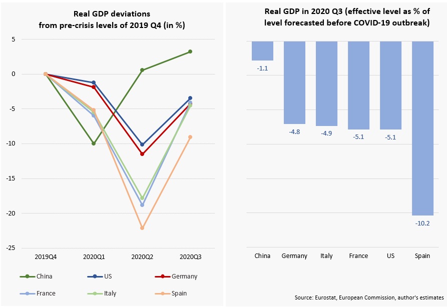 China outperformed by far the US and Euro area economies since the beginning of COVID-19 pandemics. US and Germany showed also a good resilience during the lockdown. Economic activity in France and Italy recovered very rapidly in 2020 Q3 following the collapse in the first half of the year. Spain suffered the most as real GDP has remained substantially below the pre-crisis level from 2019 Q4.