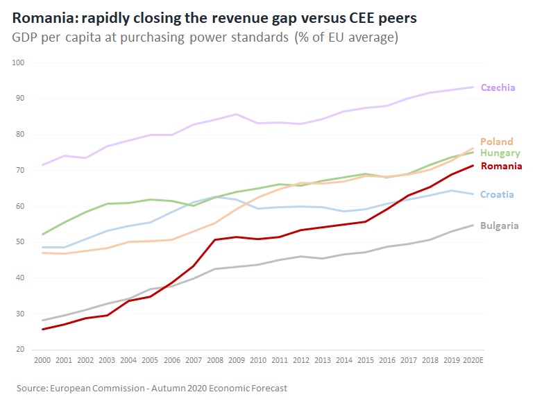 The gap between living standards in Romania and its CEE peers continued to narrow rapidly over the past 5 years.