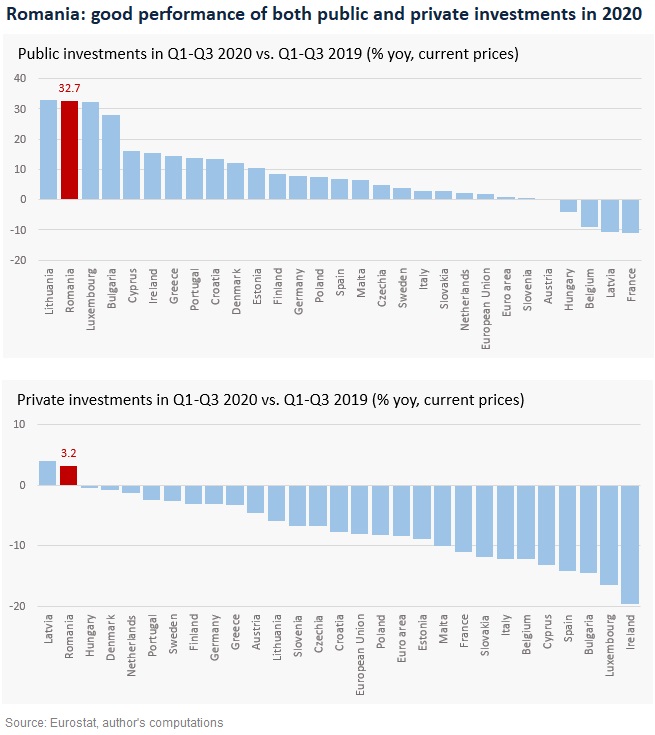 Investments’ performance was quite strong in Romania in the first three quarters of 2020, as increases were recorded both in the public and the private sector as compared with 2019.
