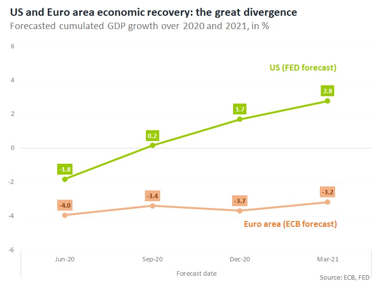 At the opposite side, Euro area economic recovery process is suffering as fiscal stimulus size is limited and the vaccination process is not progressing very fast. ECB forecast on cumulated GDP growth over 2020-2021 from March 2021 was almost similar to that published in June 2020, revealing a contraction of 3.2% in these two years.