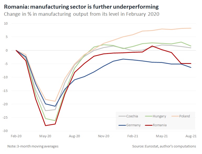 Romania’s manufacturing sector has systematically underperformed it regional peers since the beginning of pandemic.