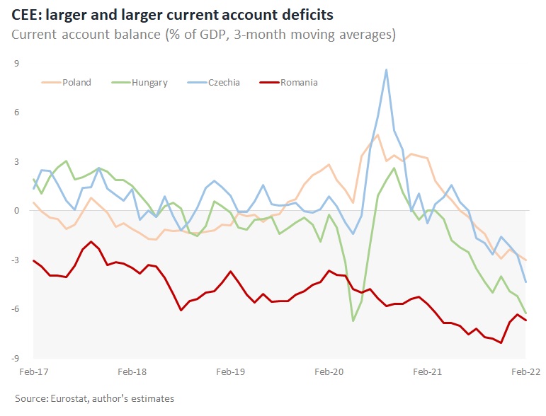 Disruptions in global value added chains and increasing commodity prices have lowered foreign trade surpluses in CEE countries (PL, HU, and CZ) over the past year, resulting in current account deficits.