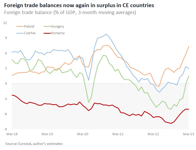Balances of foreign trade with goods and services are now again in surplus in CE countries (PL, CZ, HU). Foreign trade deficit has decreased also a lot in Romania since Q3 2022, but it still remains very elevated.