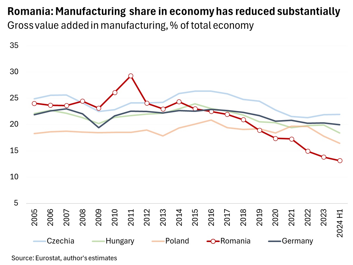 In Romania, the manufacturing sector has strongly underperformed over the recent years, and its share in total economy has decreased at a very fast pace.